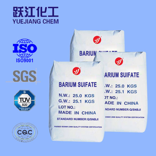 Yuejiang Brand-precipitated barium sulfate is produced in advanced chemical precipitation method, good physical properties, low mechanical impurity, even fineness; white powder or paste, non-toxic, insoluble in water, soluble in fuming sulphuric acid, stable chemical property; can absorb X-ray, and endow the materials with high density and surface finish.